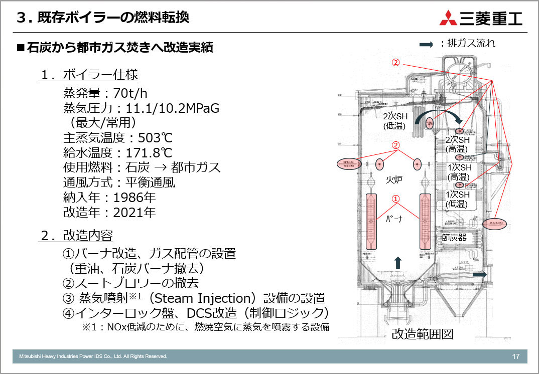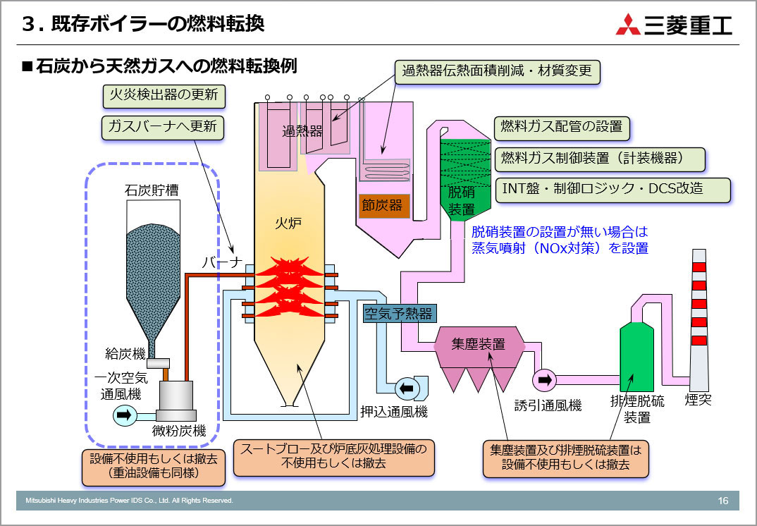 微粉炭からの燃料転換にはLNG焚き(都市ガス焚き)、バイオマス燃料化があります。石炭から天然ガス(LNG化)への改造はウェビナー投影資料の16ページを、石炭から都市ガス(13Aなど)への改造はウェビナー投影資料の17ページを参照ください。